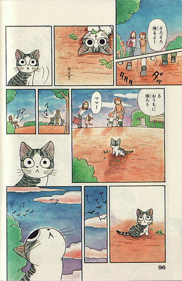 Each short, eight-page chapter of the manga focuses on one small episode in the life of Chi and the Yamada family. Chi goes for a walk. Chi goes to the vet. Chi learns that she loves milk. Chi learns how to use the litterbox. Chi climbs the stairs. Chi climbs the window curtains. And so on. These mini-adventures are tied together by the central conflicts of the series, which span several volumes at a time and are developed and resolved in surprising yet satisfying ways. The characters, especially Chi and Yōhei, also develop slowly as they gradually grow older.