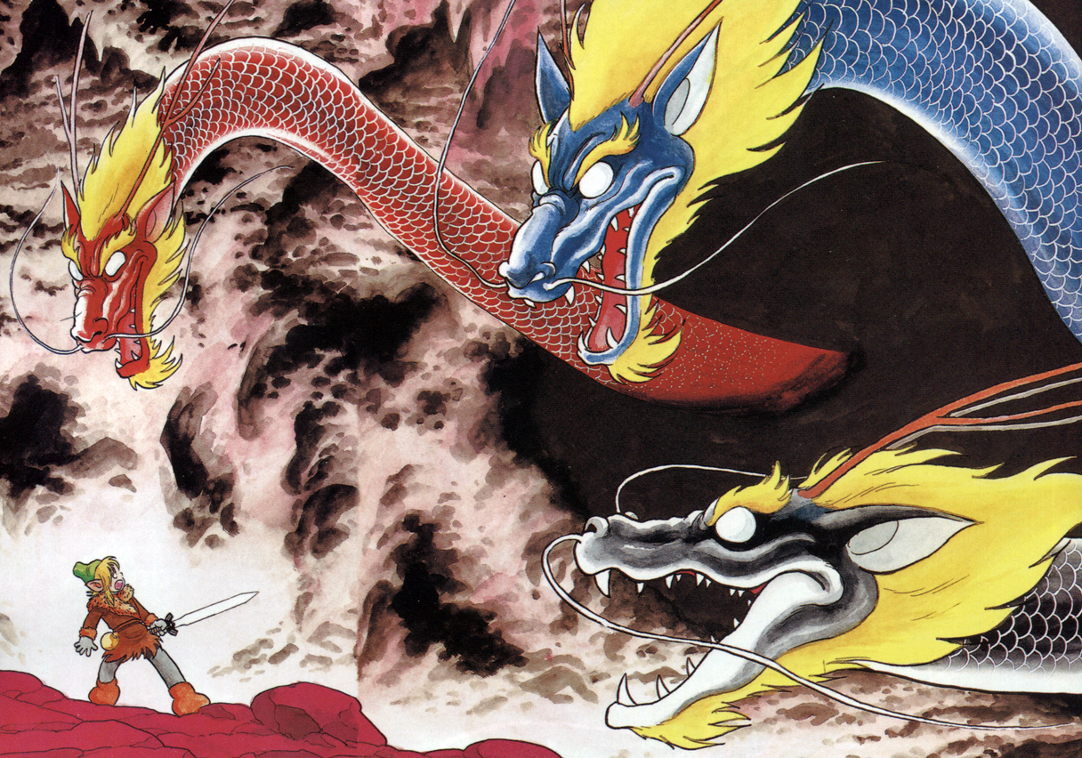 Despite the assistance of friends he encounters, Link is still one boy caught up in a legend much larger than his own life, a theme Ishinomori emphasizes with splash panels depicting Link as a faceless dot at one corner of a daunting landscape. In the game on which the manga is based, the enemy the player must engage most frequently is the environment itself, and the artist’s translation of this element into menacing backgrounds and elaborate framing devices is beautiful to behold. Ishinomori’s interpretation of Ganon’s castle, the revelation of which is a climactic moment, is especially awe-inspiring.